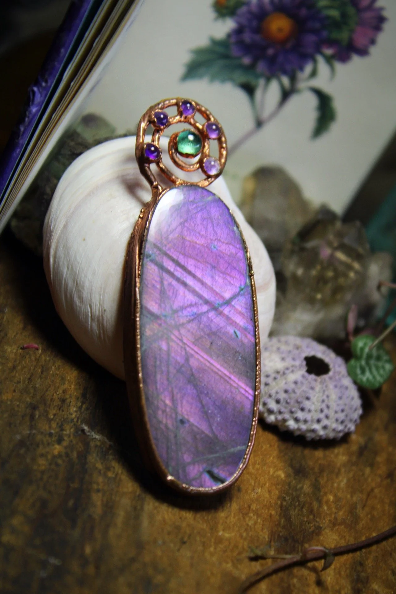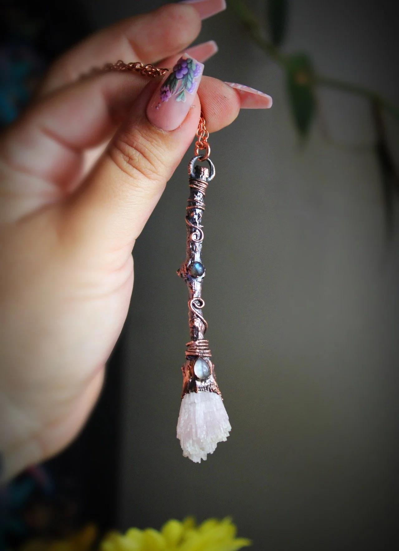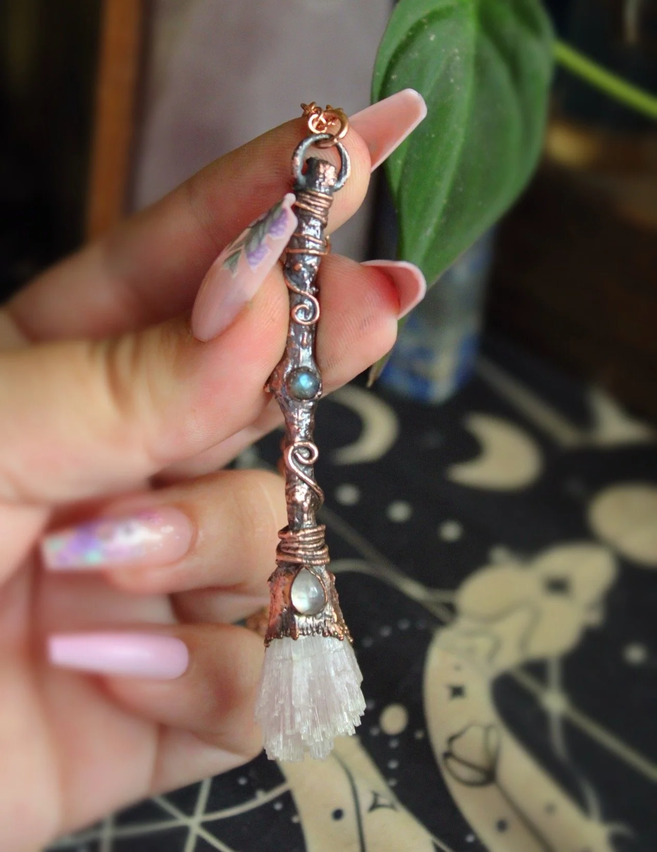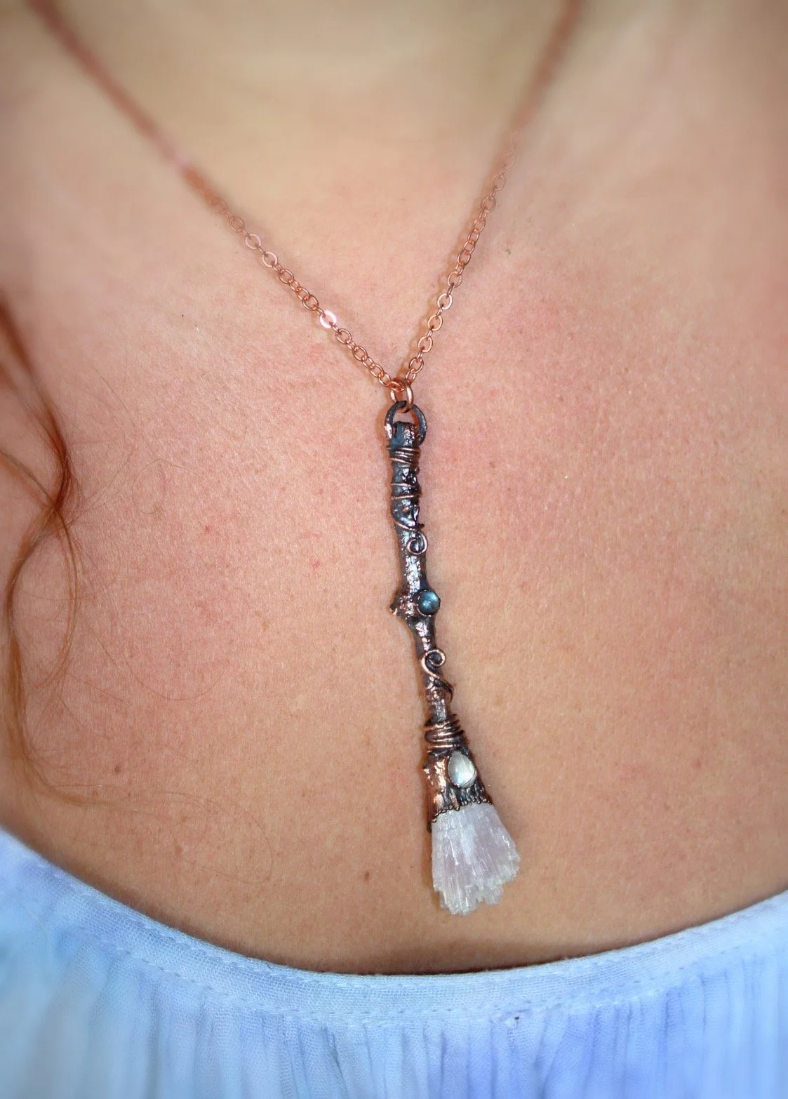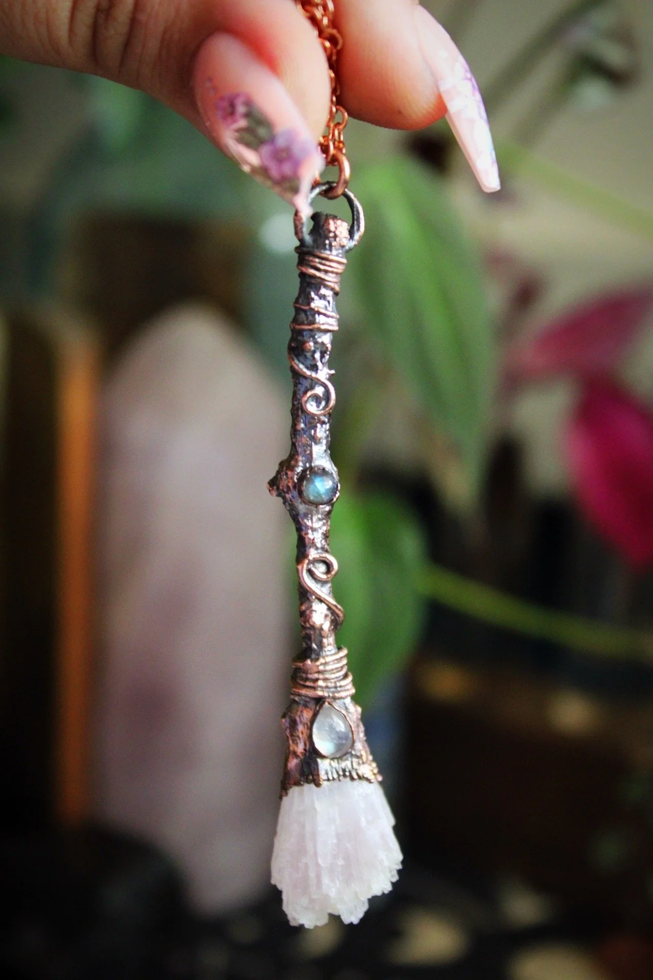 Witches broom necklace made with labradorite, moonstone and pink tourmaline