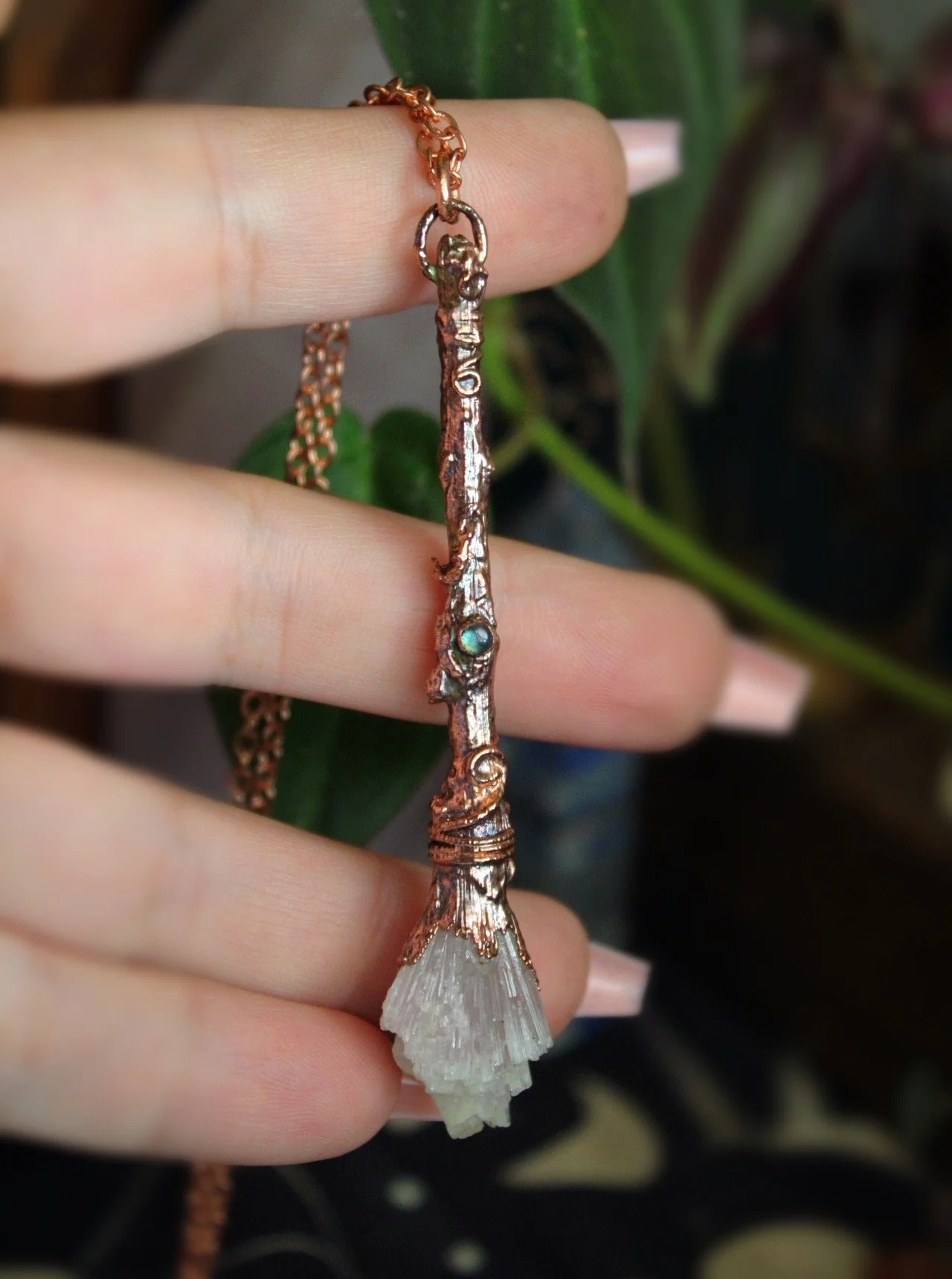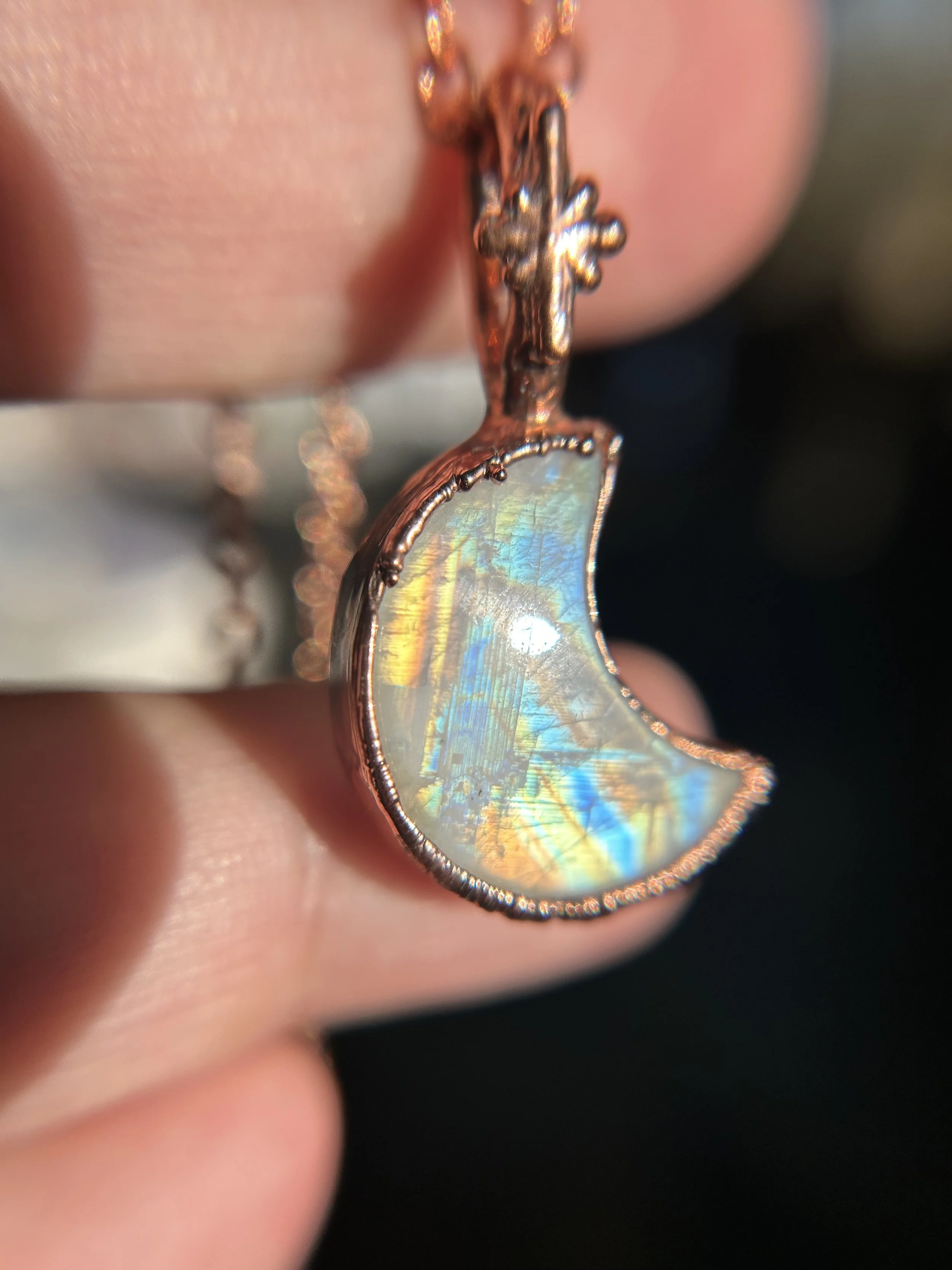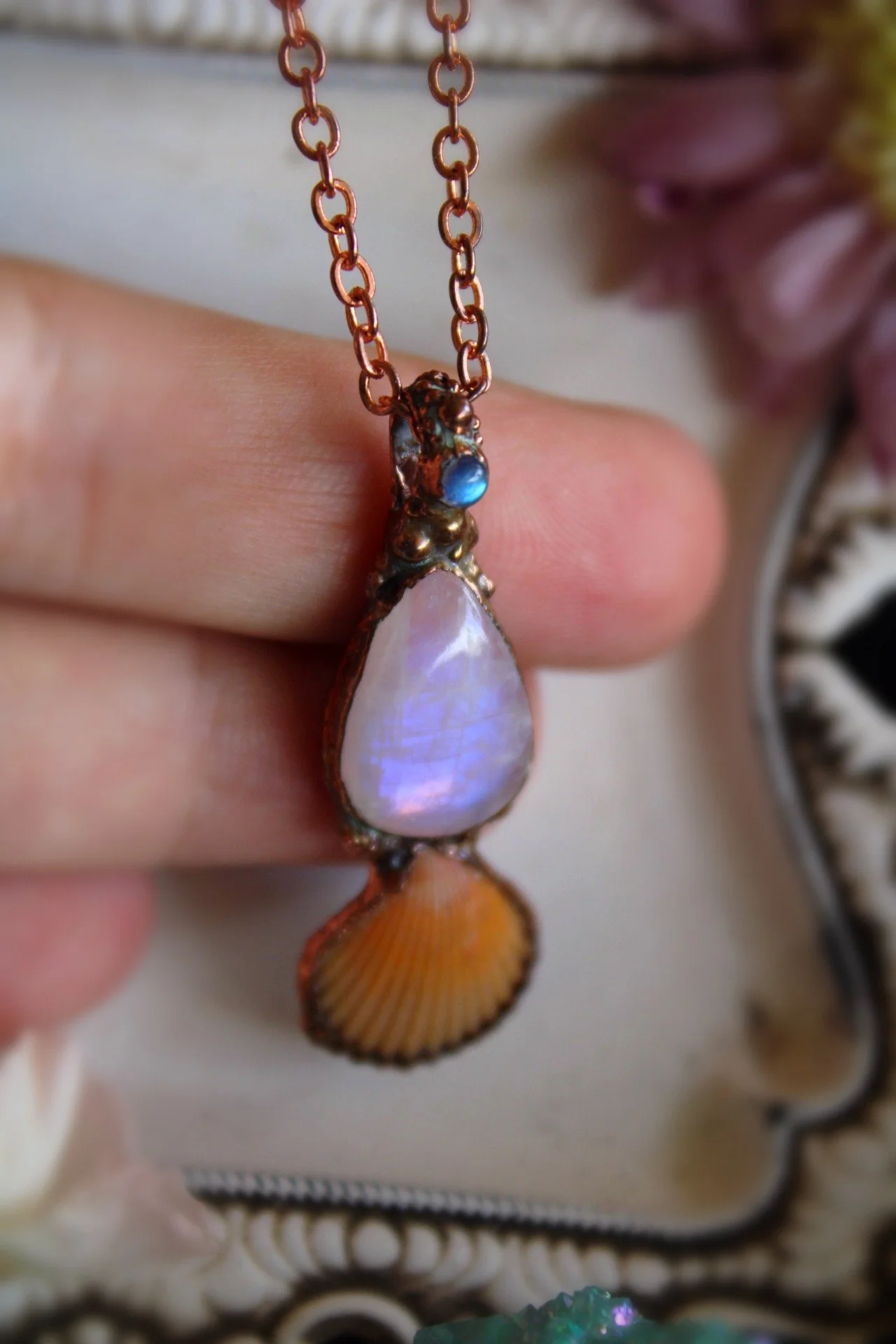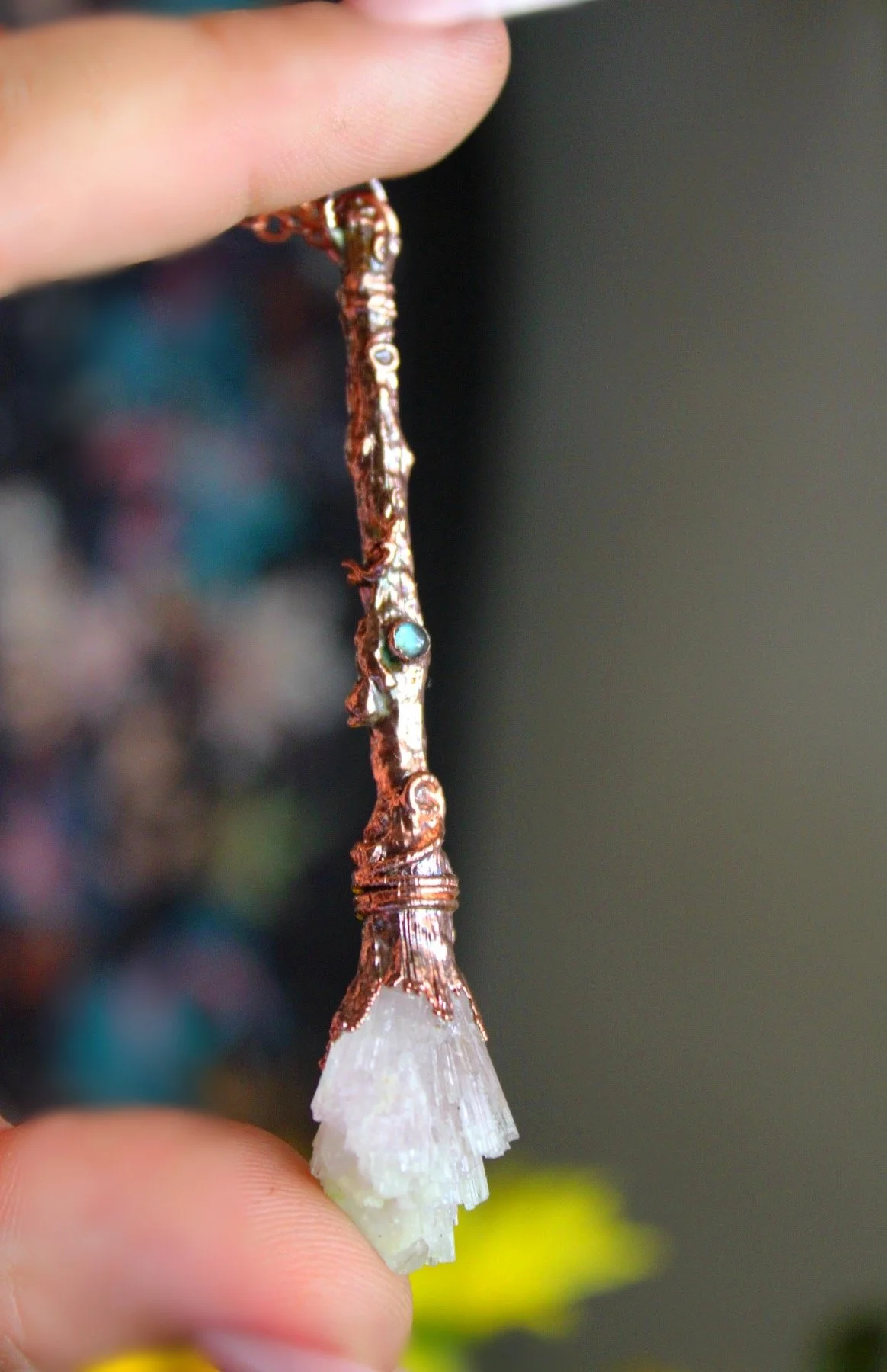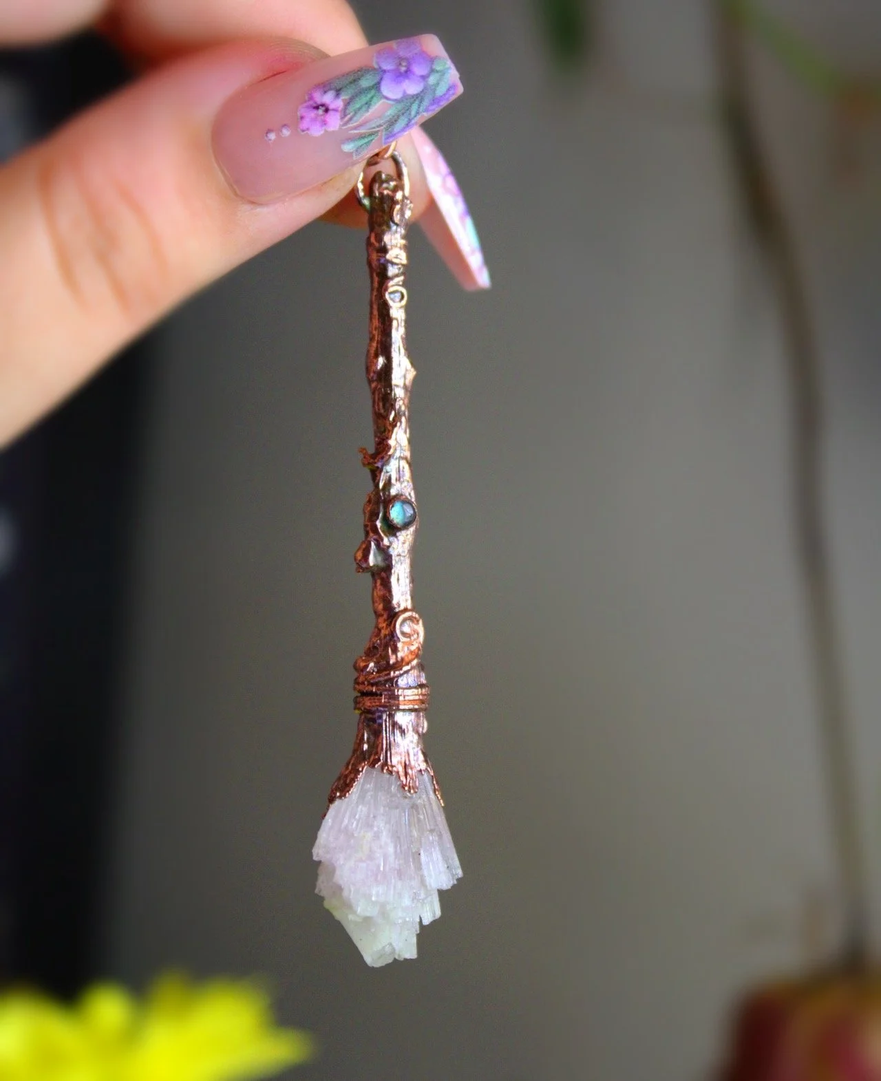 Witches broom necklace made with labradorite, moonstone and pink tourmaline