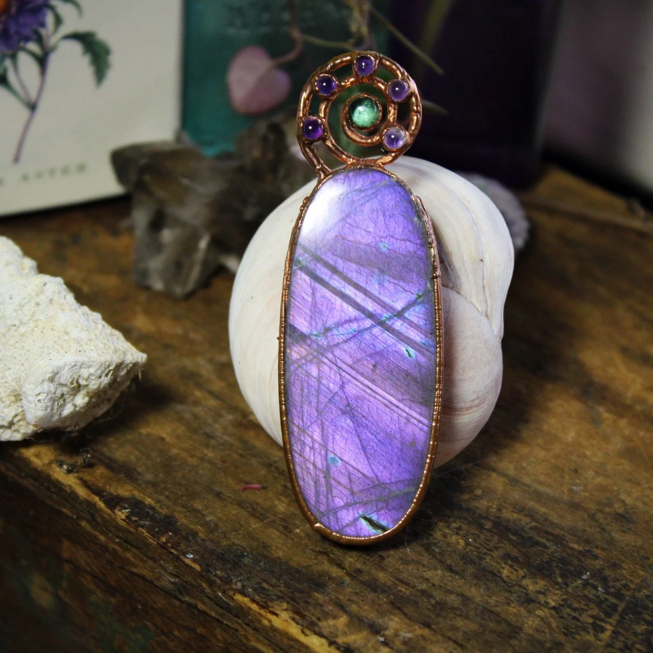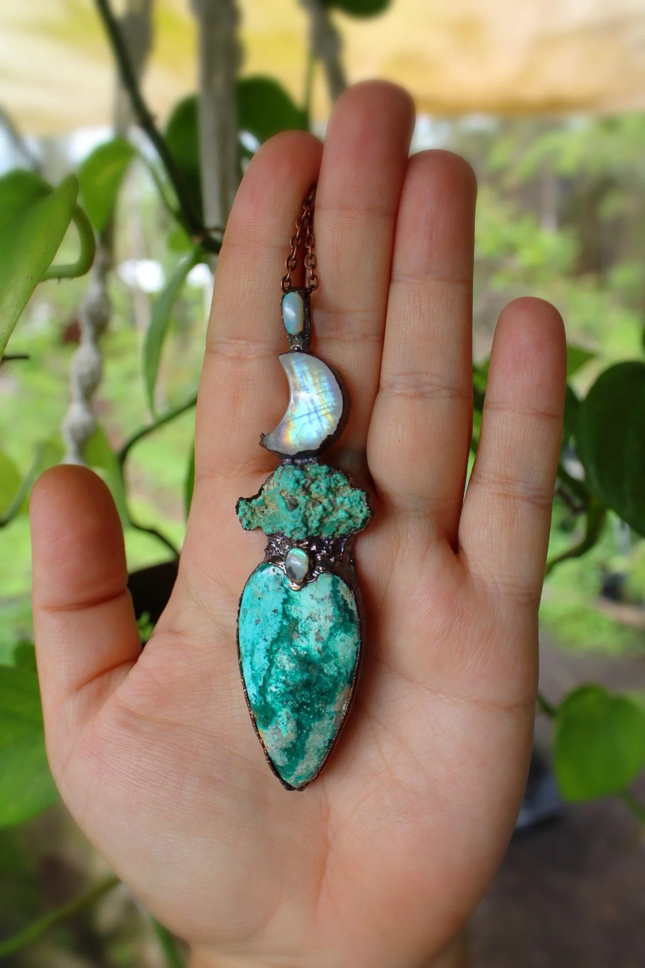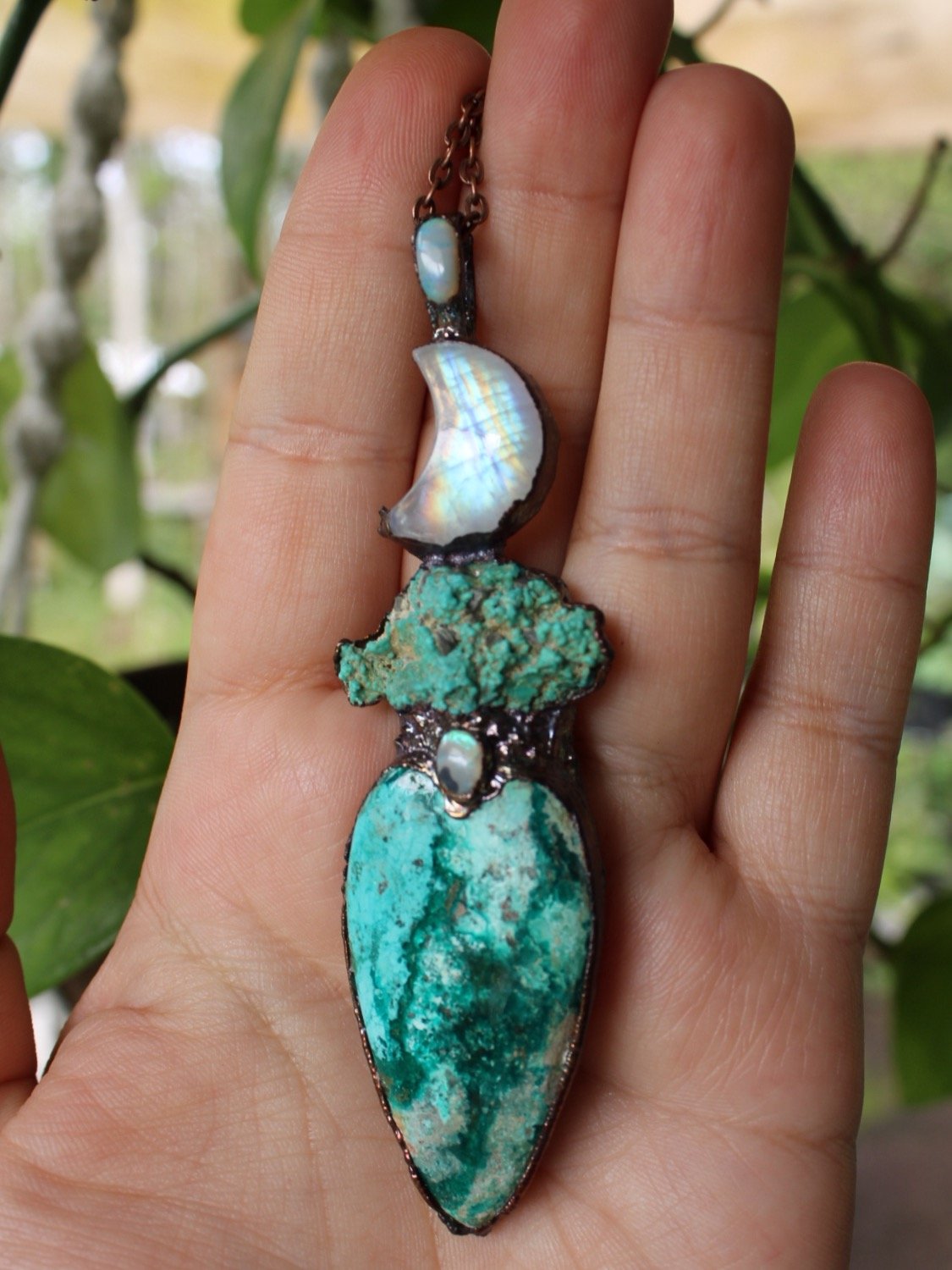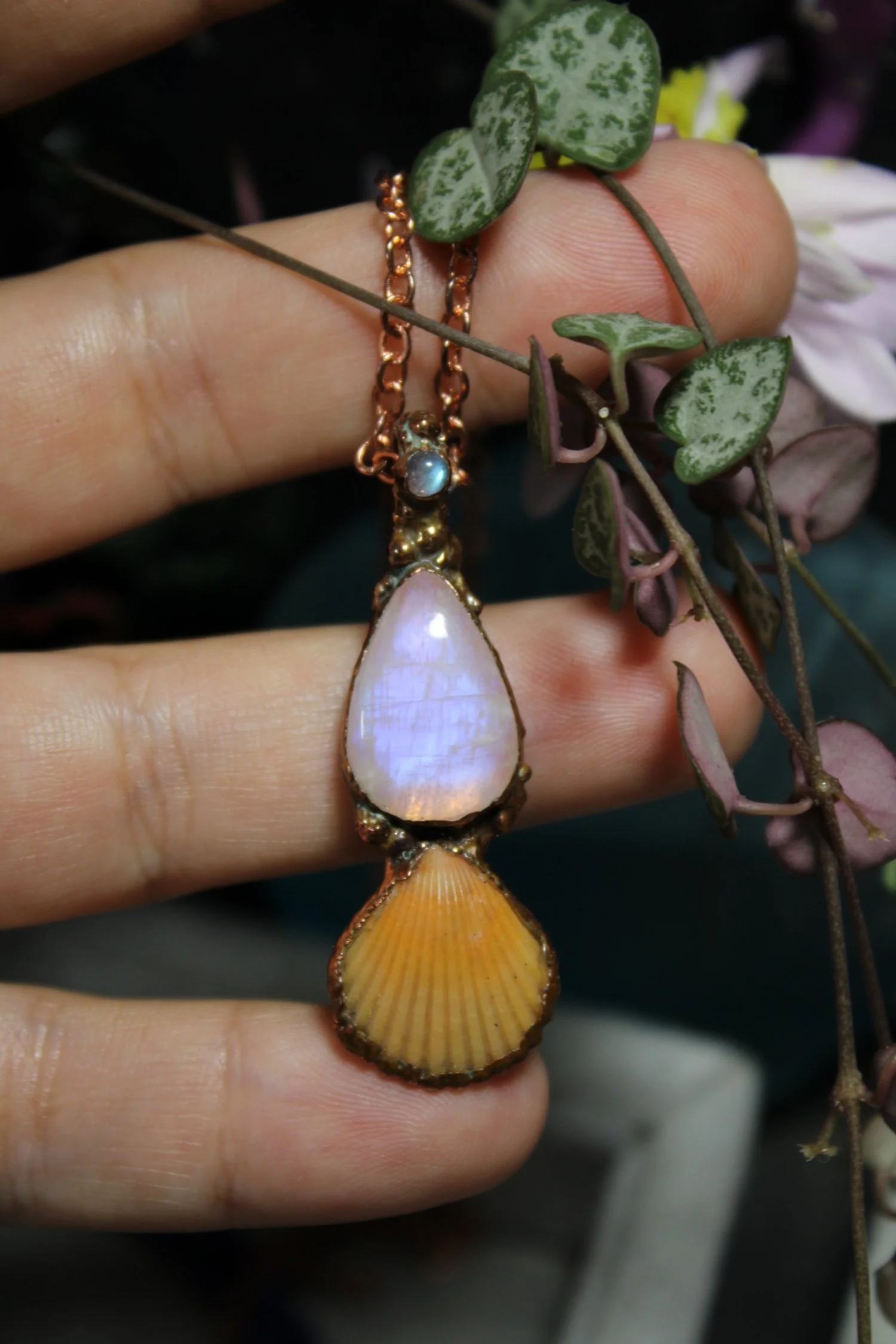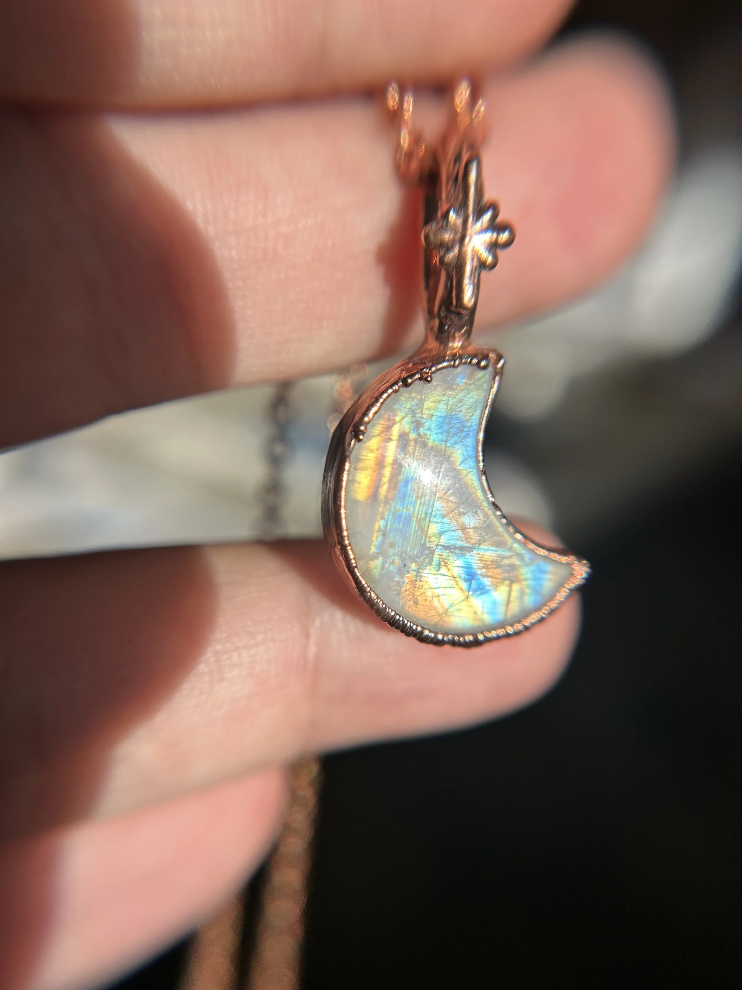 Witches broom necklace made with labradorite, moonstone and pink tourmaline