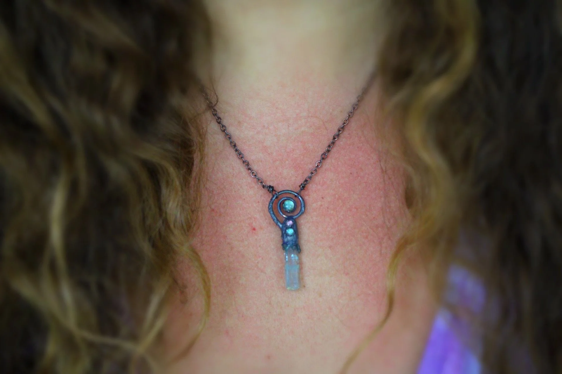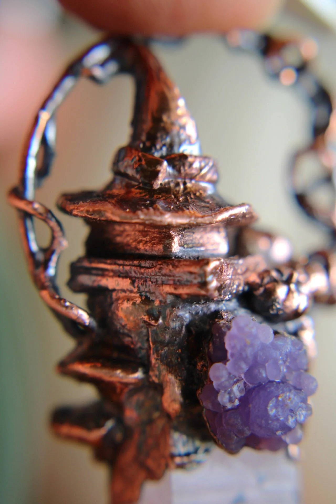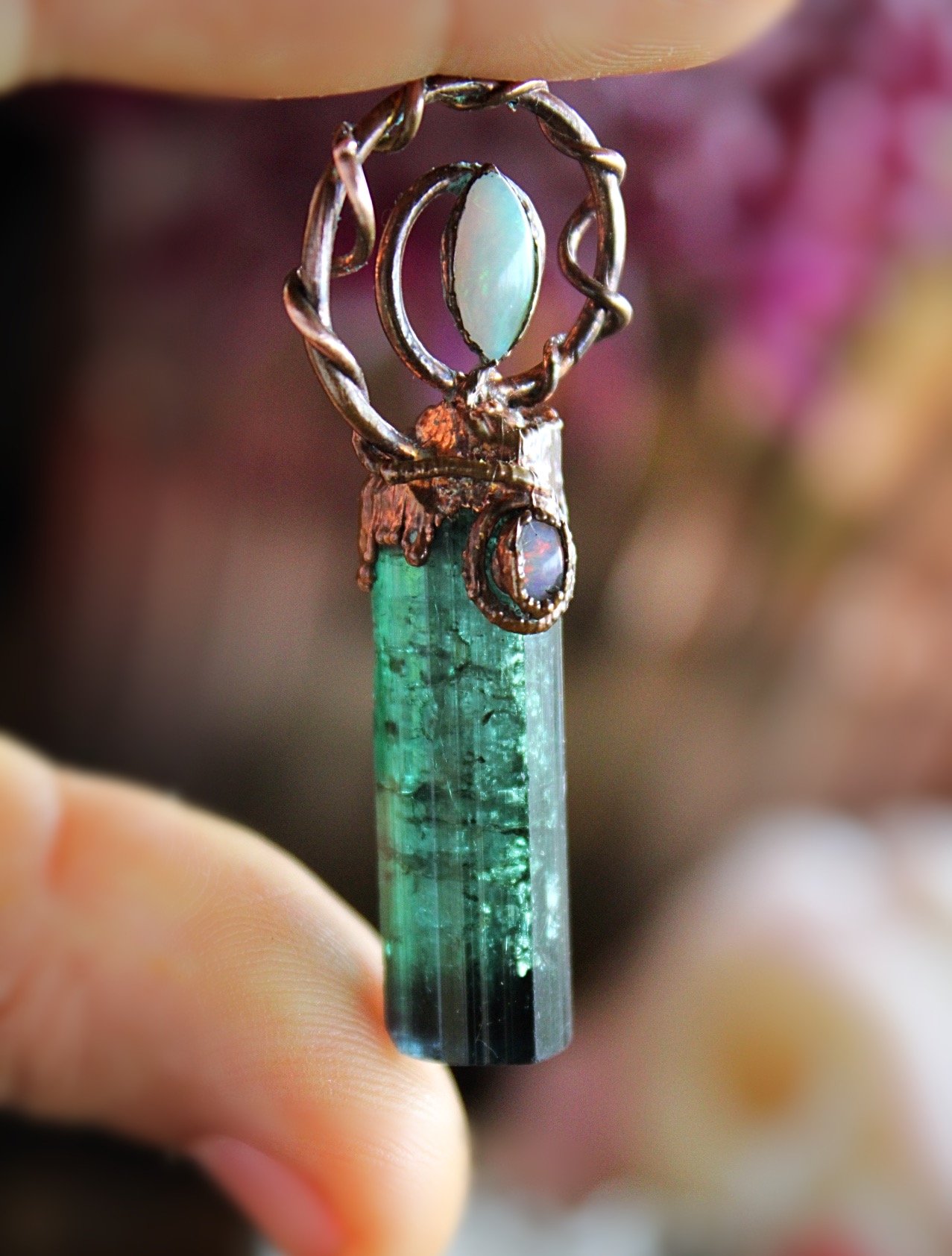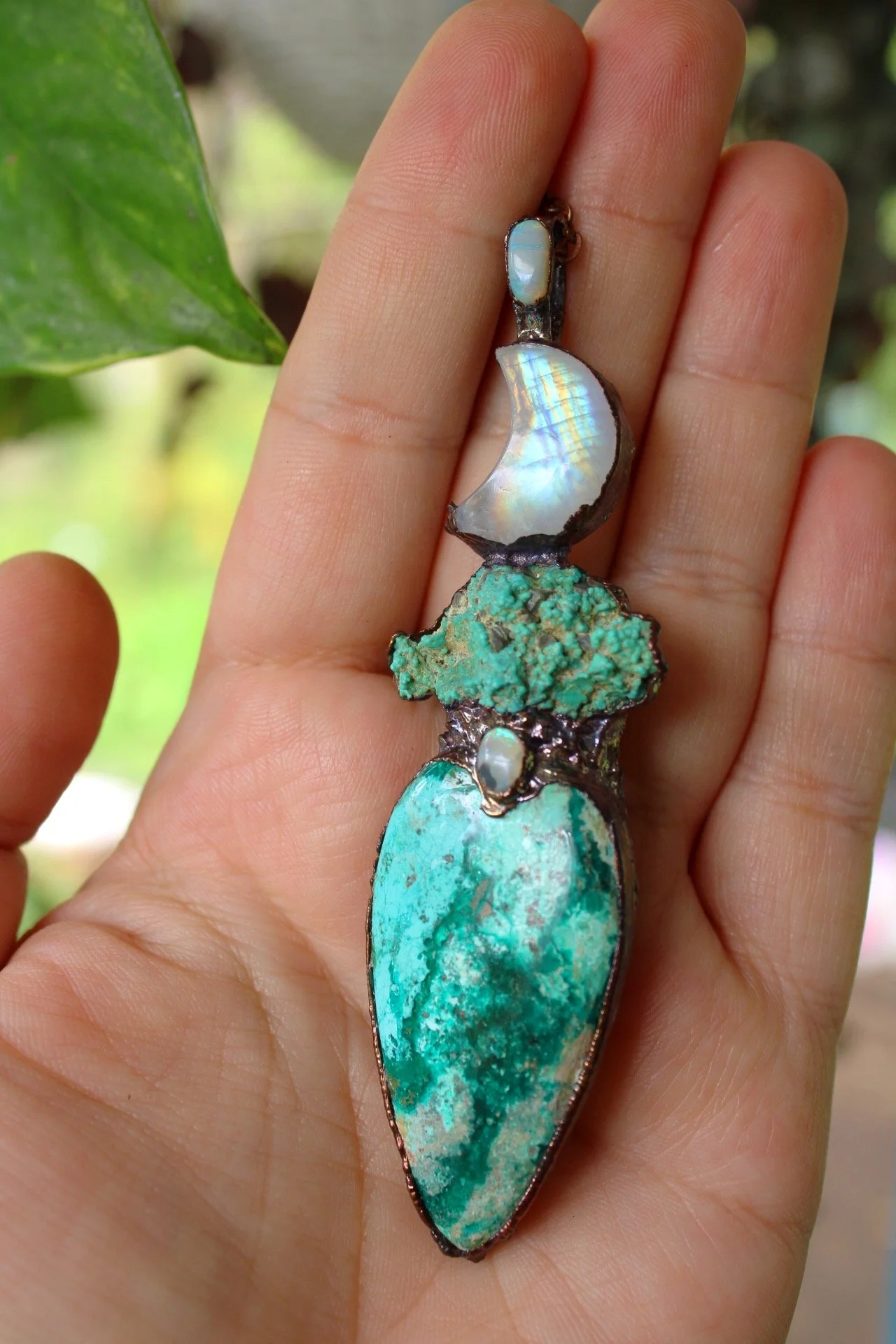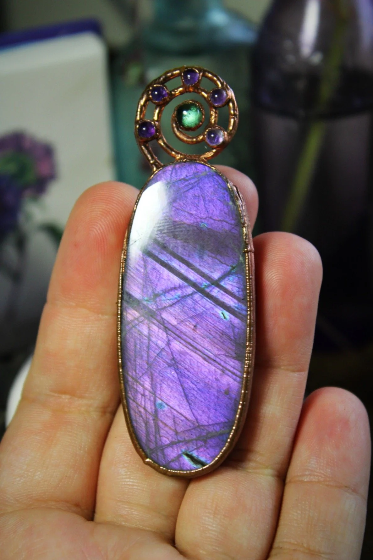 Witches broom necklace made with labradorite, moonstone and pink tourmaline