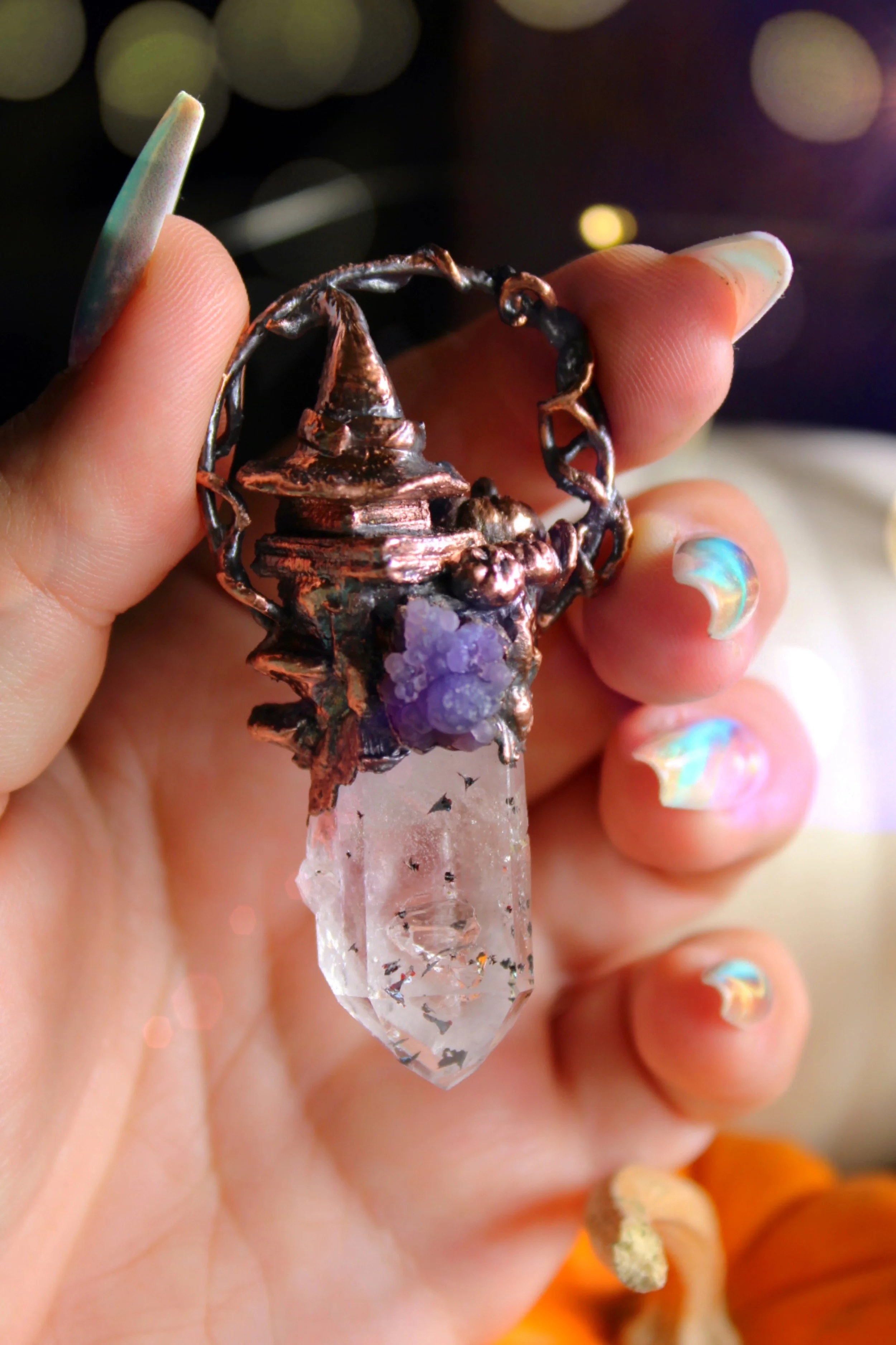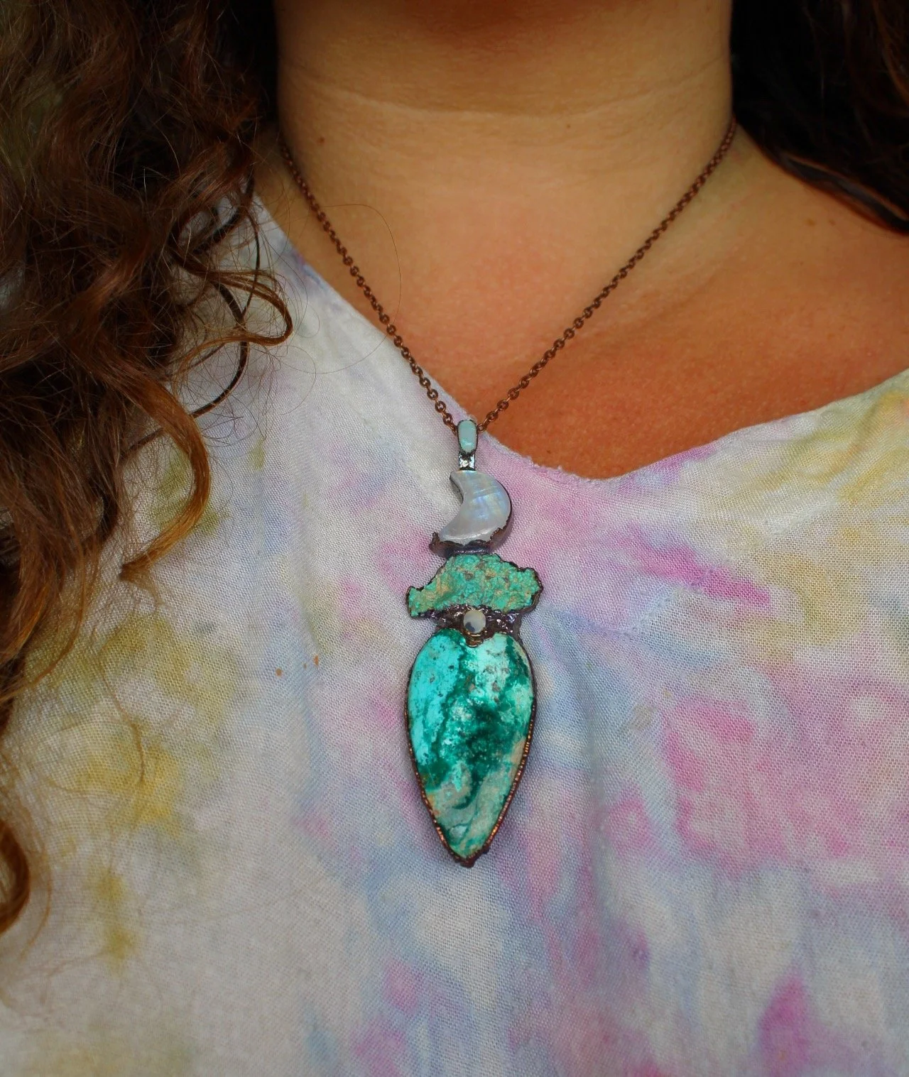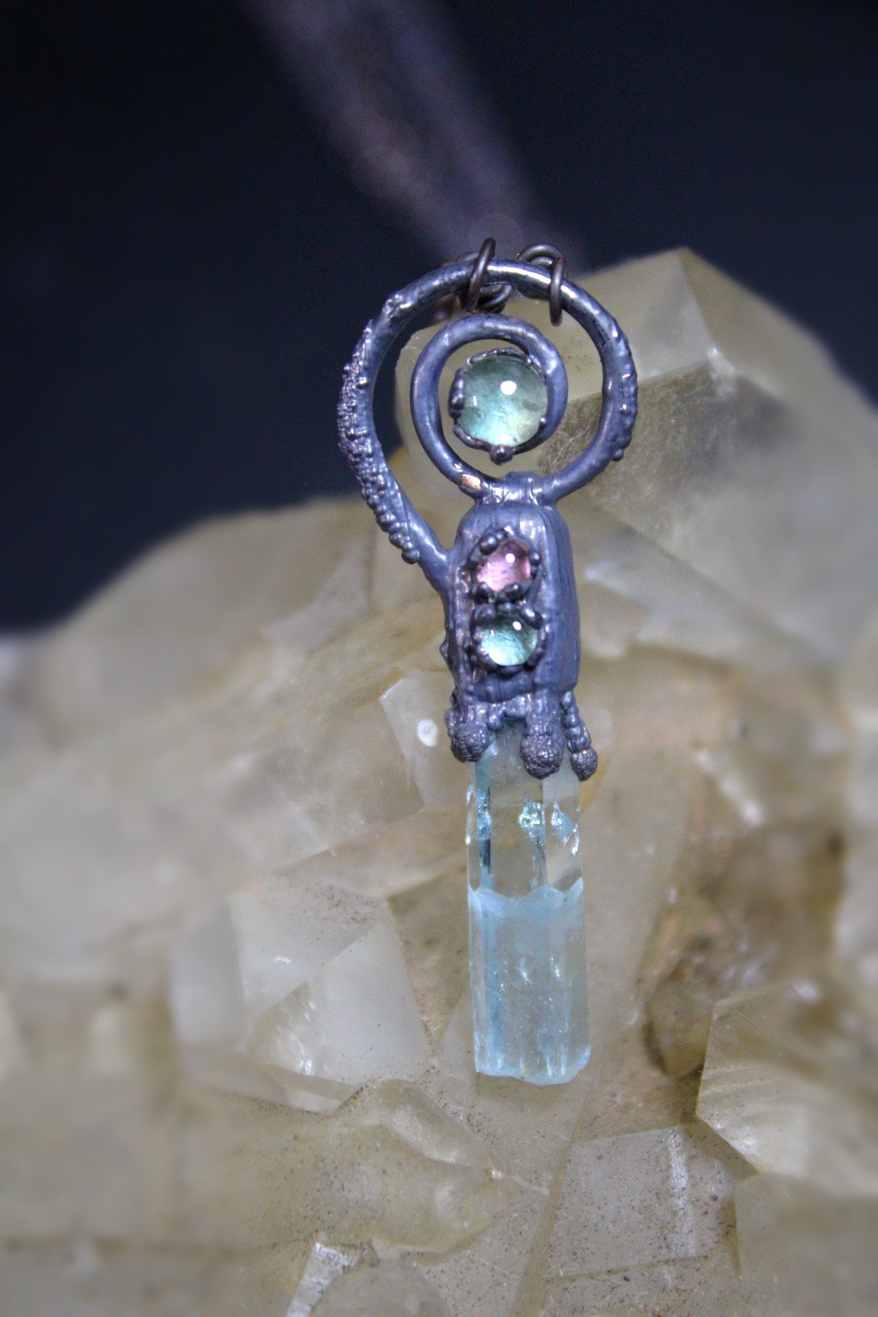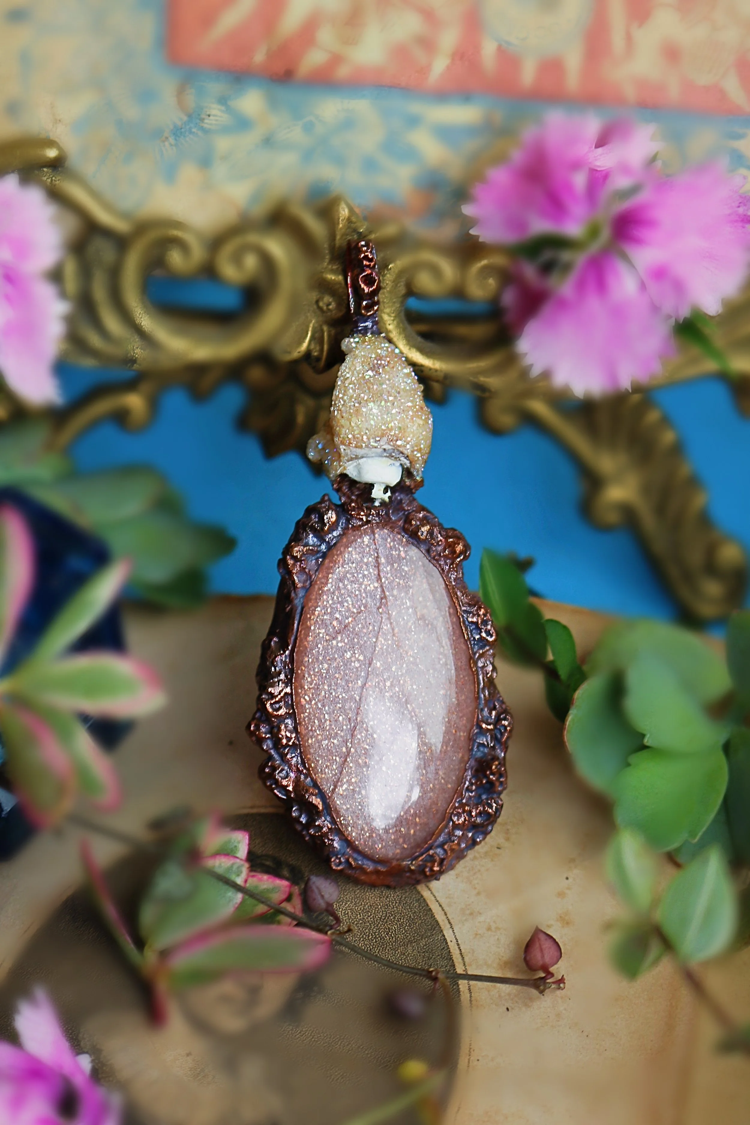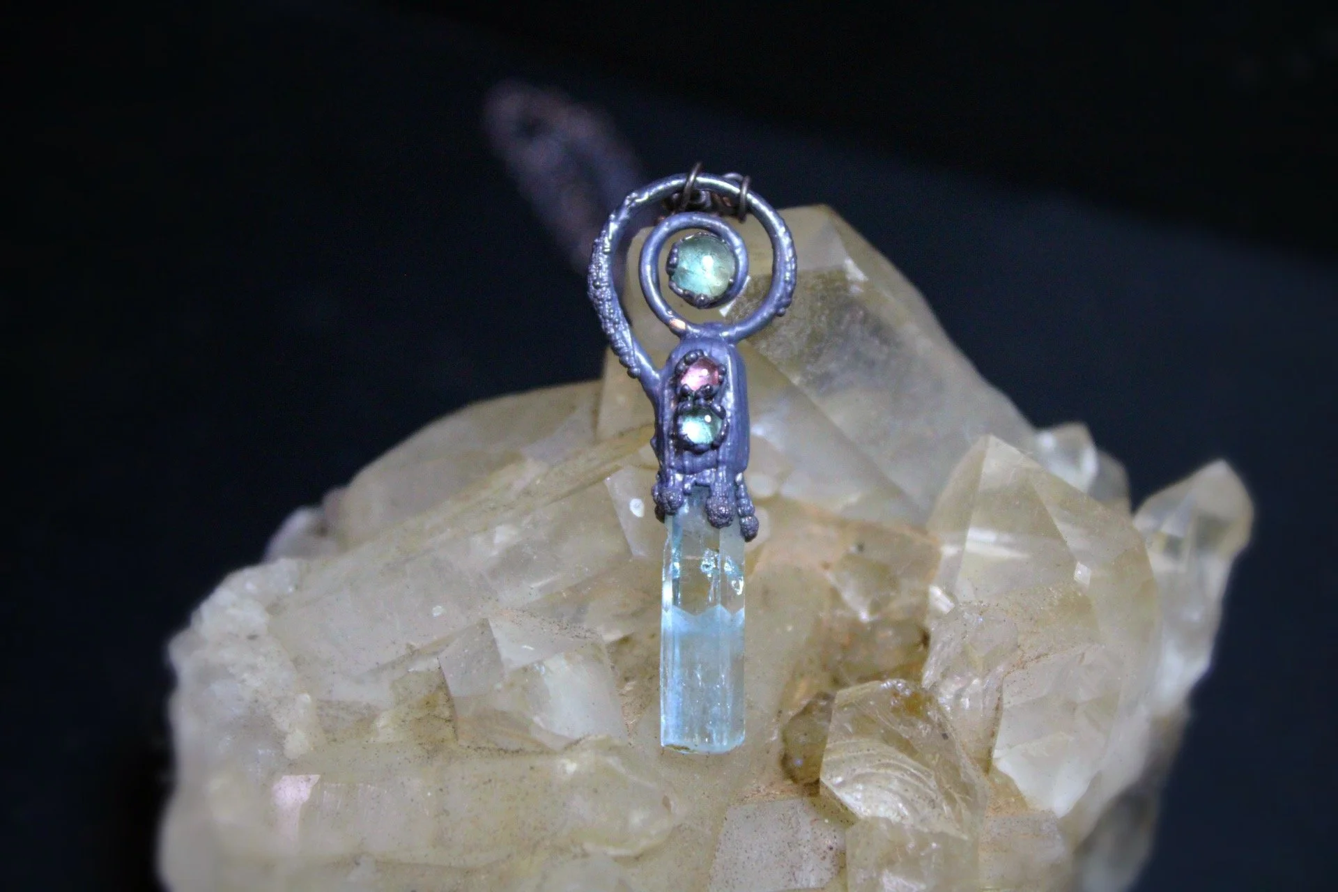 Witches broom necklace made with labradorite, moonstone and pink tourmaline